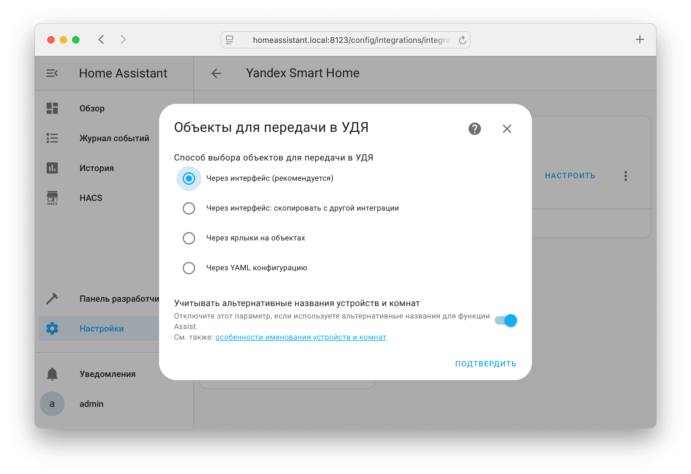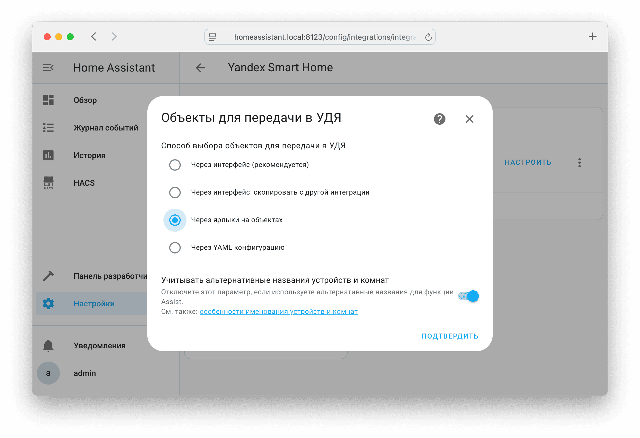 Выбрать объекты, которые будут переданы в УДЯ в виде устройств можно несколькими способами (в зависимости от ваших предпочтений): в настройках интеграции, ярлыки на объектах, или YAML конфигурацию. Способ выбора устанавливается в настройках интеграции, одновременное использование разных способов невозможно.