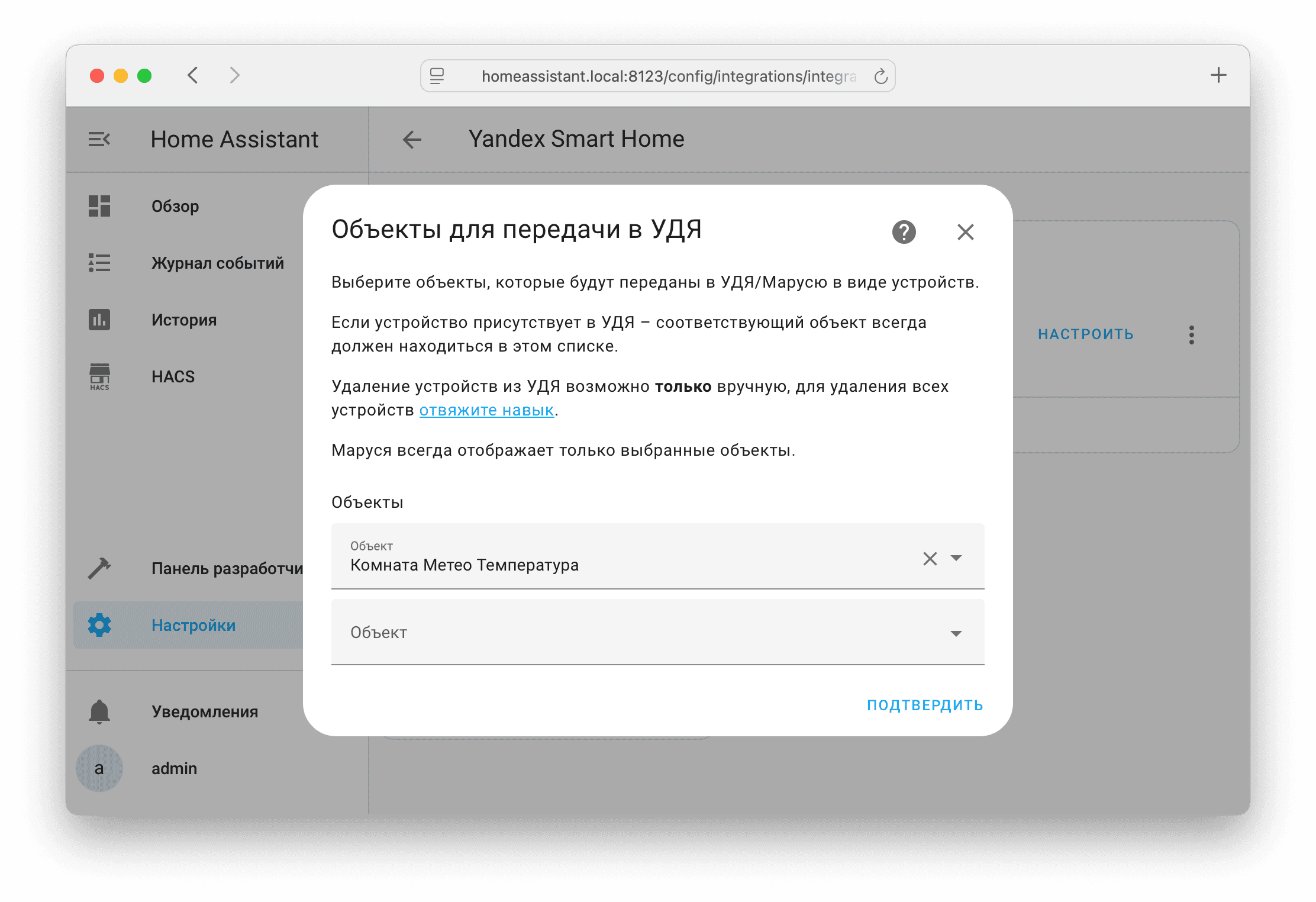 В объектах для передачи в УДЯ нужно выбрать только sensor.room_temperature.