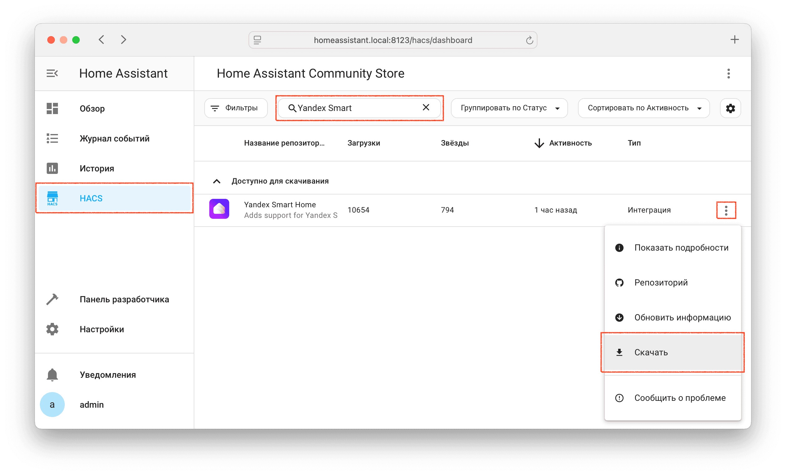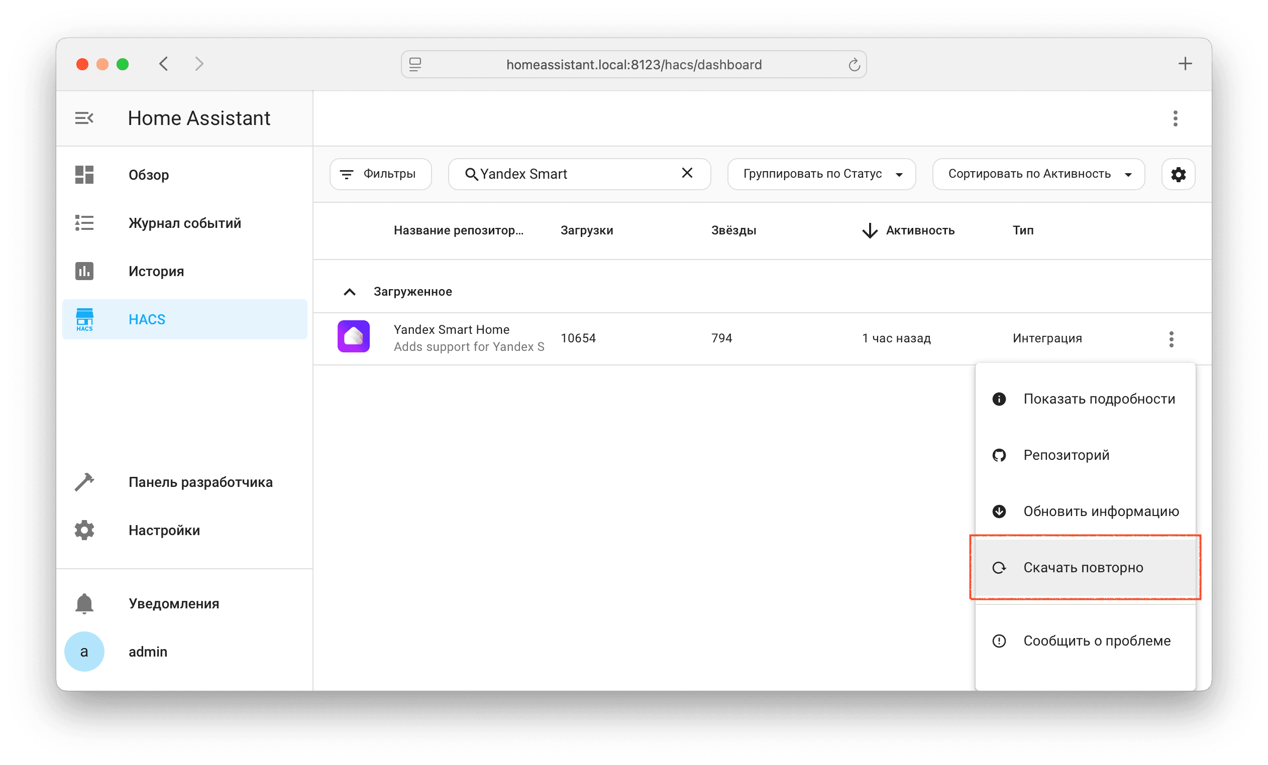 Если по какой-то причине обновление не появляется, скачайте компонент повторно через HACS: